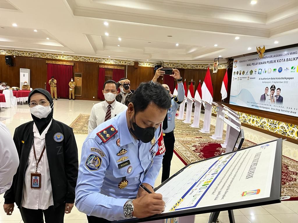 Kaltimkita.com, BALIKPAPAN - Kepala Kantor Imigrasi Kelas I TPI Balikpapan Rakha Sukma Purnama didampingi Kasi Teknologi Informasi dan Komunikasi Keimigrasian Adrian Soetrisno pada Senin (05/09) melakukan Penandatanganan Dokumen Kerja Sama (Nota Kesepakatan, Kesepakatan Bersama, Perjanjian Kerja Sama) dan Maklumat Pelayanan MPP Kota Balikpapan di Balai Kota Kantor Wali Kota Balikpapan.