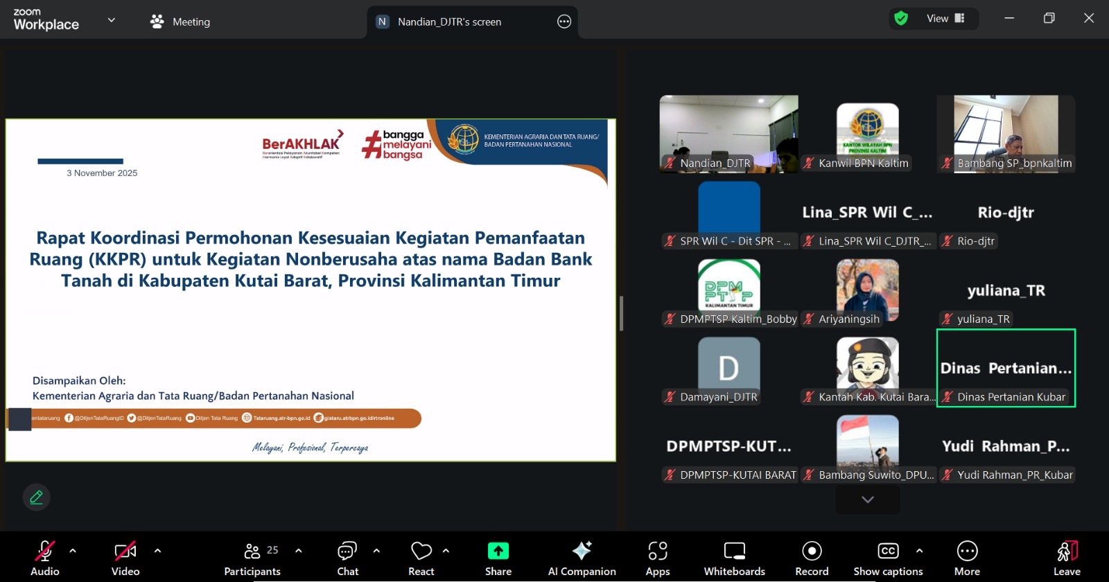 KaltimKita.com, Samarinda - Kepala Bidang Penataan dan Pemberdayaan Kantor Wilayah BPN Provinsi Kalimantan Timur Bambang Sugeng Prijanto mengikuti Rapat Koordinasi Permohonan Kesesuaian Kegiatan Pemanfaatan Ruang (KKPR) untuk Kegiatan Non-Berusaha atas nama Badan Bank Tanah di Kabupaten Kutai Barat yang diselenggarakan oleh Direktorat Jenderal Tata Ruang Kementerian ATR/BPN secara daring melalui video konferensi, Senin (03/11/2025).