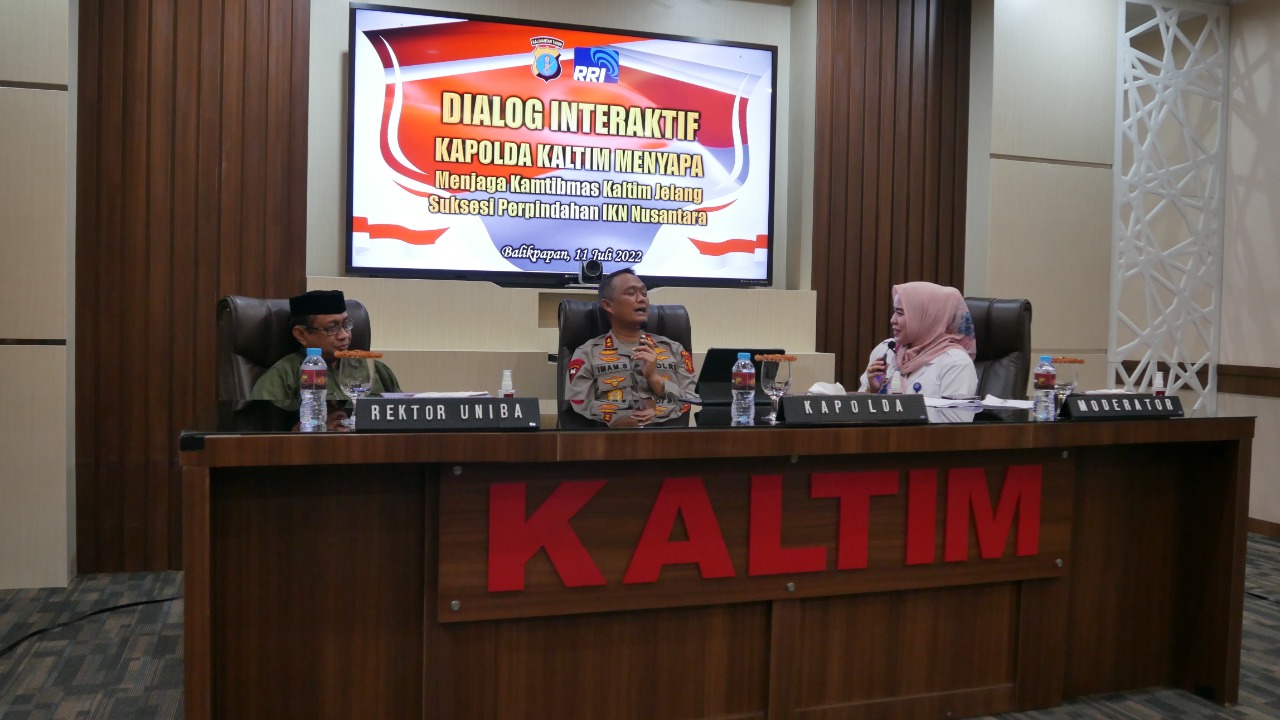 KaltimKita.com, BALIKPAPAN - Pembangunan Ibu Kota Negara (IKN) Nusantara sebentar lagi terlaksana. Hal ini yang membuat semua sektor akan mempersiapkan diri. Salah satunya dalam hal menjaga kamtibmas. Ya melalui RRI Samarinda menggelar dialog khusus dengan Kapolda Kaltim, Irjen Pol Imam Sugianto, Senin (11/7/2022) kemarin. Mengangkat tema ”menjaga kamtibmas Kaltim jelang suksesi perpindahan IKN Nusantara”, turut hadir dalam dialog tersebut, Rektor Universitas Balikpapan Dr Isradi Zainal.
