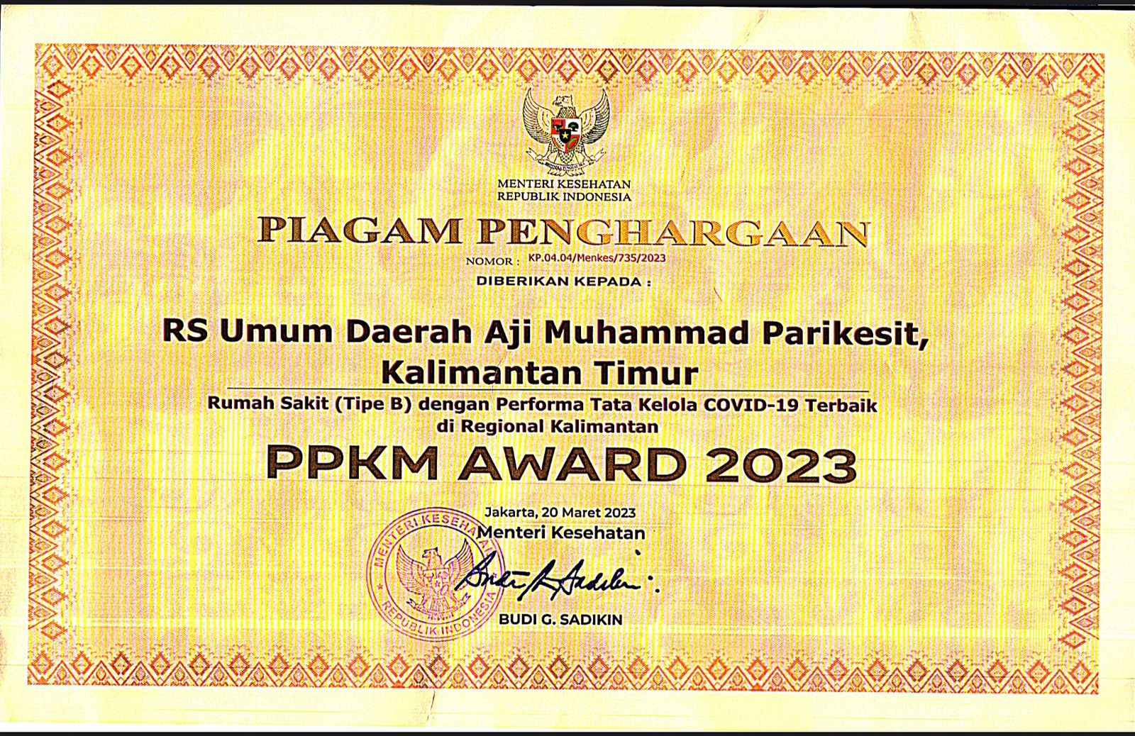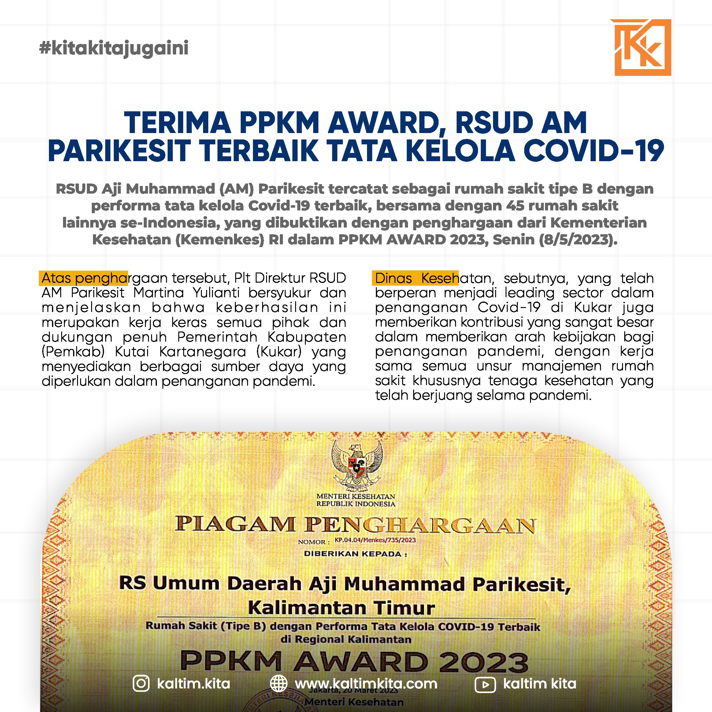 Kaltimkita.com, KUTAI KARTANEGARA - Rumah Sakit Umum Daerah (RSUD) Aji Muhammad Parikesit Tenggarong mendapat penghargaan dari Kementerian Kesehatan Republik Indonesia dalam PPKM AWARD 2023 sebagai Rumah Sakit (Tipe B) dengan Performa Tata Kelola Covid-19 terbaik di Regional Kalimantan bersama 45 rumah sakit lainnya se Indonesia, Senin (8/5/2023).