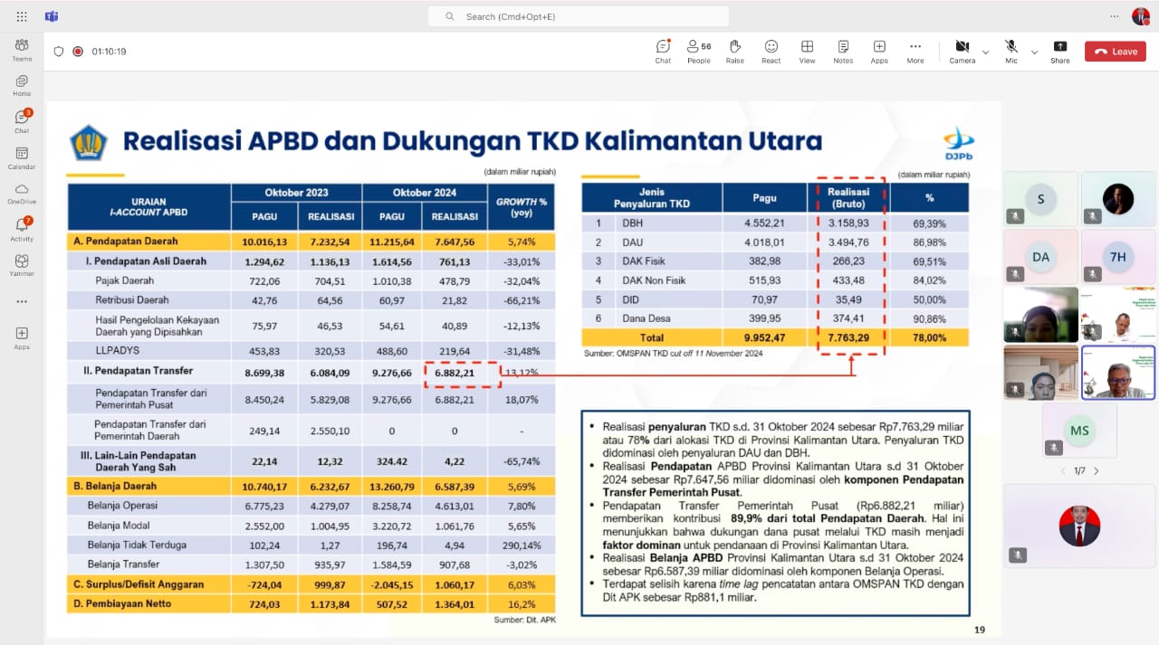 Agenda rapat kali ini adalah untuk membahas perkembangan Anggaran Pendapatan dan Belanja Negara (APBN) pada Provinsi Kalimantan Timur dan Provinsi Kalimantan Utara dari bulan Januari sampai dengan bulan Oktober 2024. Pemaparan perkembangan APBN disampaikan oleh Kepala Kanwil Direktorat Jenderal Kekayaan Negara (DJKN) Kalimantan Timur dan Utara Jose Arif Lukito,