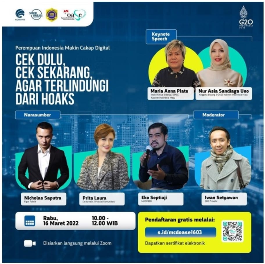 Kegiatan Perempuan Makin Cakap Digital akan diselenggarakan pada tanggal 16 Maret 2022 dan mengusung tema "Cek Dulu, Cek Sekarang, Agar Terlindungi Dari Hoaks". Kegiatan online ini menghadirkan tiga narasumber yang sudah terkenal dalam gerakan literasi digital, termasuk Nicholas Saputra (Figur Publik), Eko Septiaji (Mafindo), dan Prita Laura (Ex-Jurnalis/Praktisi Komunikasi).