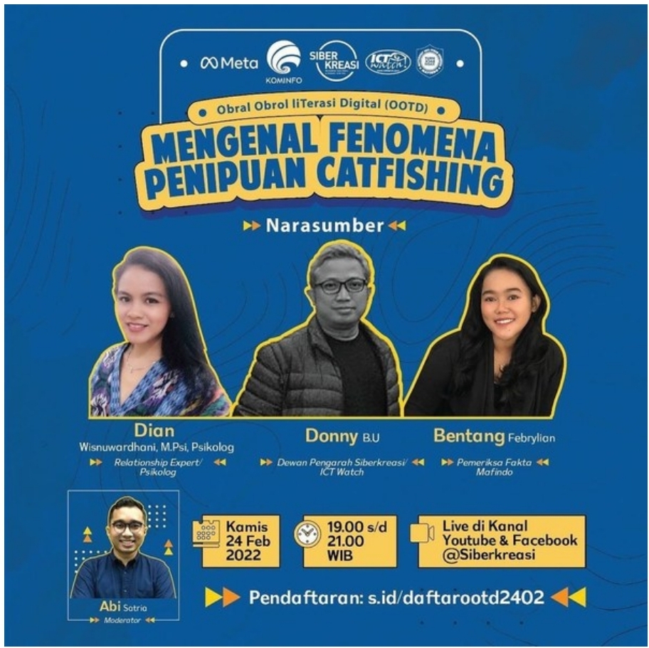 Pembicara tamu terkemuka yang hadir di acara ini antara lain: Relationship Expert & Psikolog, Dian Wisnuwardhani; Pemeriksa Fakta MAFINDO, Bentang Febrylian; dan Dewan Pengarah Siberkreasi / ICT Watch, Donny B.U. Mengenal Fenomena Catfishing Catfishing merupakan istilah yang digunakan untuk menggambarkan penipuan yang menggunakan identitas online palsu untuk mengelabuhi korban.