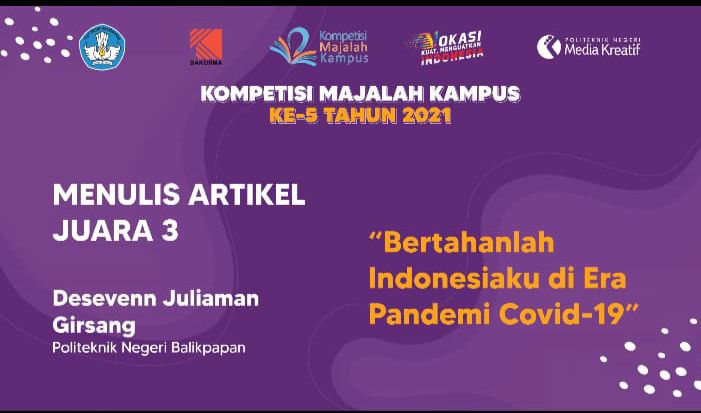 Pada kategori lain, mahasiswa atas nama Desevenn Juliaman Girsang sukses menyabet juara ketiga melalui penulisan artikel. Ia mengangkat judul “Bertahanlah Indonesiaku di Era Pandemi Covid-19”yang dibimbing oleh Lisnawaty Simatupang S.S.,M.Hum.