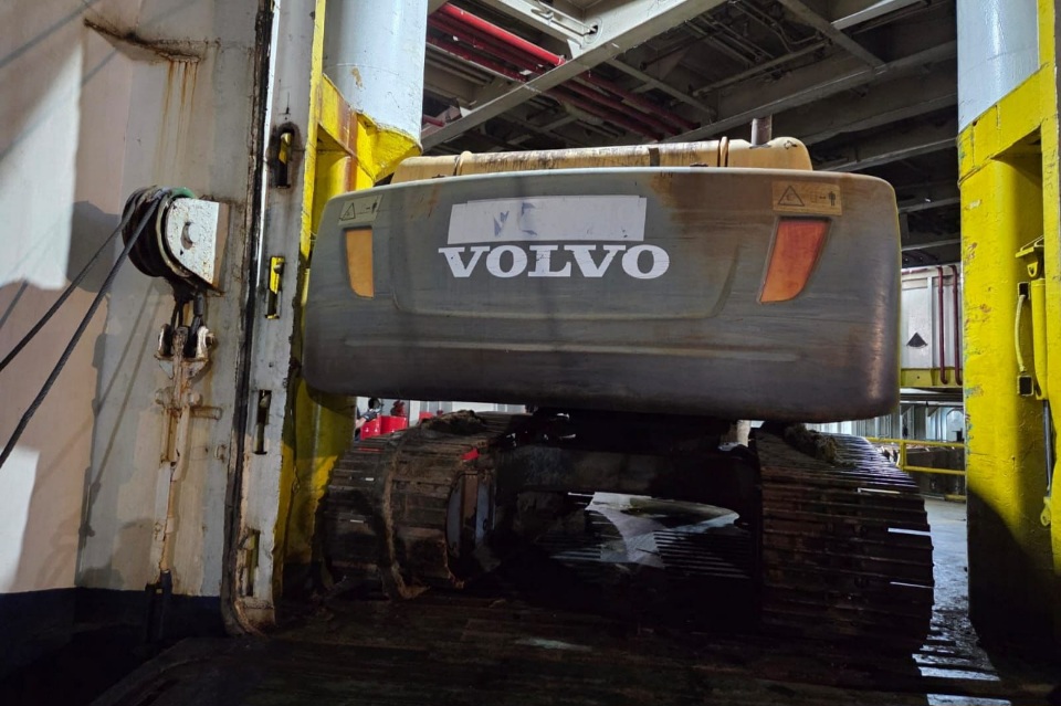Saat itu, petugas sedang menaikkan unit ekskavator ke atas kapal yang bersandar di posisi sisi kanan.