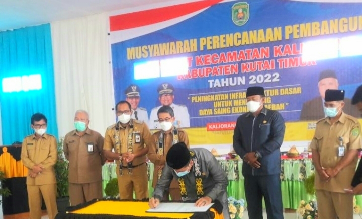 KaltimKita.com, KUTAI TIMUR - Ketua DPRD Kutai Timur menandatanganai Berita Acara usulan melalui Musyawarah Perencanaan Pembangunan Kecamatan (Musrembangcam) Kaliorang, yang berlangsung di Desa Bukit Harapan,SP2 Kecamatan Kaliorang Selasa, (23/03/2021).