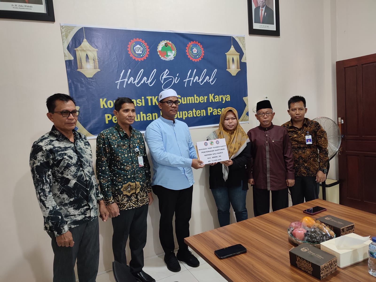 KaltimKita.com, TANA PASER - Koperasi Tenaga Kerja Bongkar Muat (TKBM) Sumber Karya Pelabuhan Paser menggelar Halalbihalal dengan mitra kerja dan para pembina koperasi. Momen ini sekaligus pemberian santunan kepada PNS Dinas Perindustrian Perdagangan Koperasi dan UKM Paser Andri yang baru saja meninggal dunia pekan lalu.