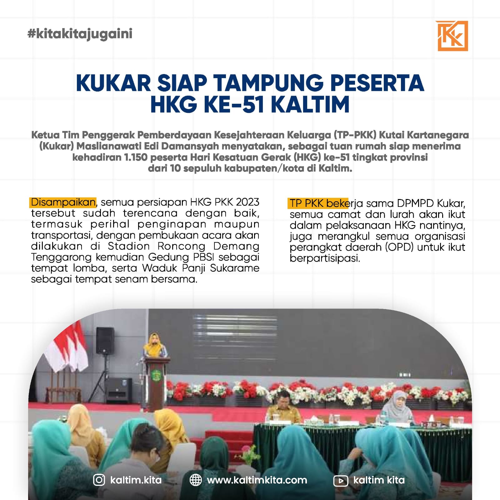 Kaltimkita.com, KUTAI KARTANEGARA – Sebagai tuan rumah Hari Kesatuan Gerak (HKG) ke-51 Tingkat provinsi Kalimantan timur (Kaltim), Ketua Tim Penggerak Pemberdayaan Kesejahteraan Keluarga (TP-PKK) Kabupaten Kukar Maslianawati Edi Damansyah, siap menjadi tuan rumah yang baik dan siap menampung 1.150 peserta kader PKK di 10 kabupaten/kota.