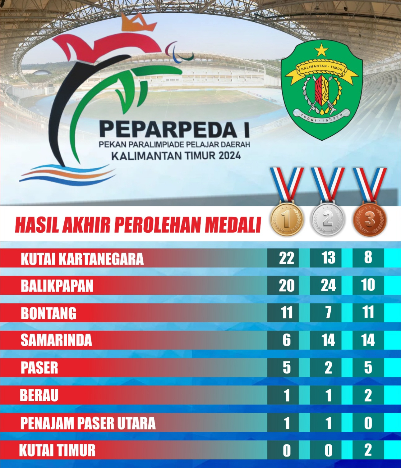 KaltimKita.com, KUKAR - Tuntas sudah pelaksanaan Pekan Paralimpiade Pelajar Daerah (Peparpeda) I/2024 di Kutai Kartanegara. Tuan rumah dipastikan menjadi juara umum pada perhelatan pertama tingkat pelajar difabel se-Kaltim, 11-14 Desember 2024. Dari enam cabang olahraga yang dipertandingkan, mereka mengoleksi 22 emas, 13 perak dan 8 perunggu. Di posisi kedua dihuni Balikpapan dengan 20 emas, 24 perak dan 10 perunggu serta Bontang dengan 11 emas, 7 perak dan 11 perunggu yang berada pada peringkat ketiga.