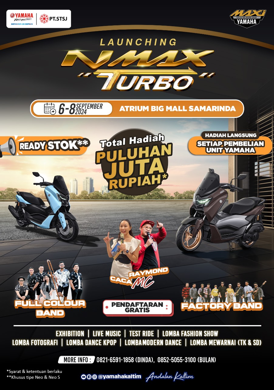 “Karena pada lauching NMAX “Turbo” di Big Mall Samarinda ini, banyak hadiahnya dan banyak hiburannya,” tegas Efendy Ariadi. Launching NMAX Turbo yang dijadwalkan berlangsung selama tiga hari pada 6-8 September ini, Yamaha menyiapkan total hadiah puluhan juta rupiah. Selain itu juga ada hadiah langsung untuk pembelian unit Yamaha.