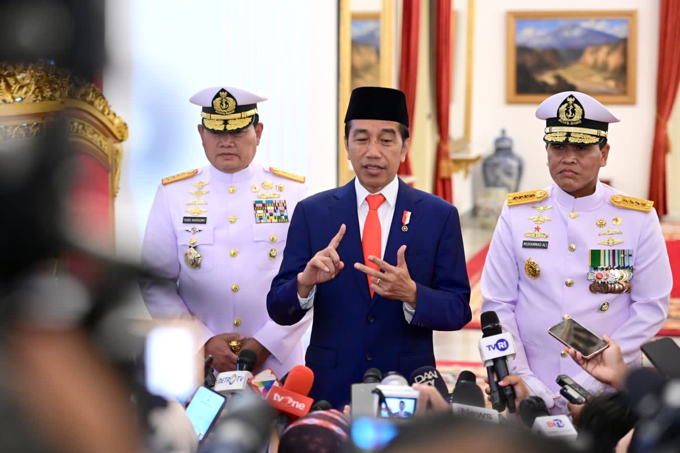 “Kita tahu dua per tiga Indonesia ini adalah air, adalah laut. Jadi konsentrasi untuk kedaulatan negara utamanya di laut itu yang menjadi tanggung jawab besar dari KSAL yang baru, Pak Muhammad Ali,” ujar Jokowi.
