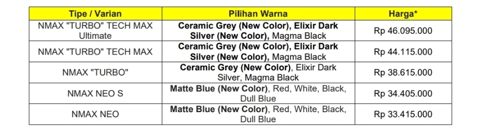 NMAX “TURBO” dan NMAX NEO saat ini dipasarkan dengan varian dan warna berikut: