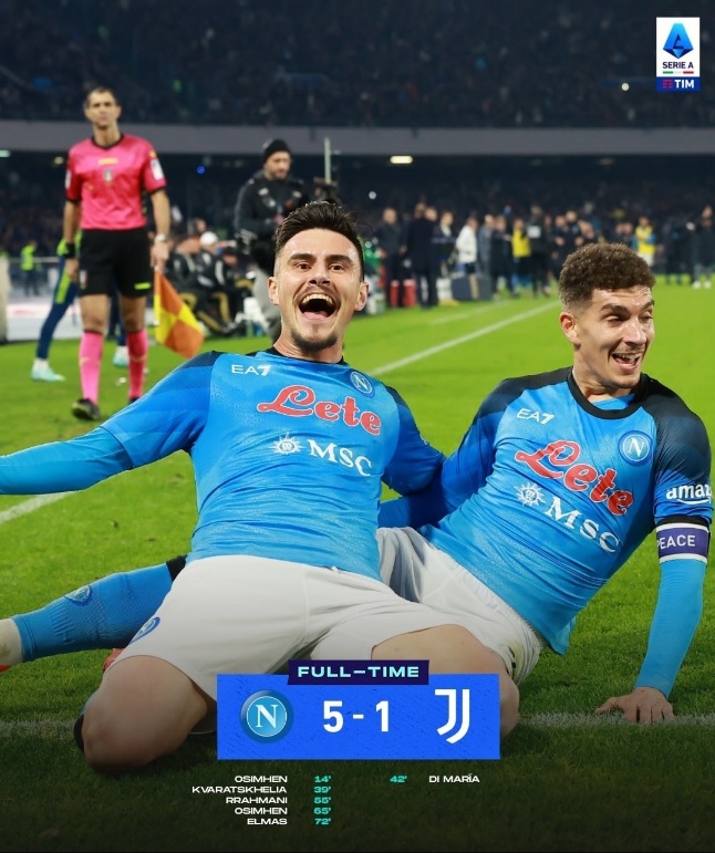 Victor Osimhen (14’, 65’), Khvicha Kvaratskhelia (39’), Amir Rrahmani (55’), dan Eljif Elmas (72’) bergantian membobol gawang Wojciech Szczesny. Gol dengan skema cantik yang dicetak Angel Di Maria (42’) hanyalah hiburan semu buat Juventus.