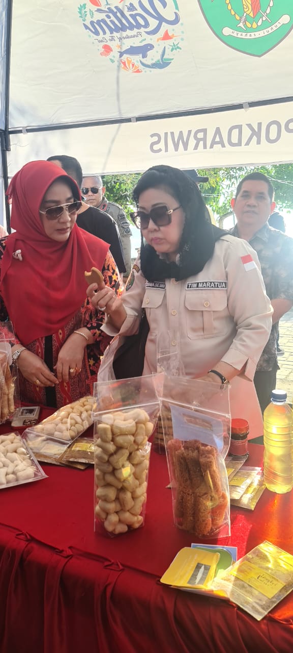 Bupati Berau Sri Juliarsih MS bersama Ketua Tim Percepatan Maratua Dr Meiliana meninjau hasil olahan UMKM Maratua.