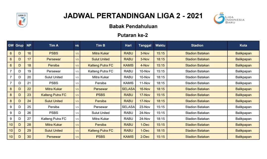 Mengingat kick-off putaran kedua akan berlangsung mulai Rabu, 3 November 2021 yang akan diawali dengan pertandingan PSBB Biak vs Mitra Kukar pada pukul 16.15 Wita dan dilanjutkan dengan laga Persewar Waropen vs Sulut United pukul 19.15 Wita, seluruh panitia dan keamanan yang bertugas datang ke stadion selambat-lambatnya satu jam sebelum laga.