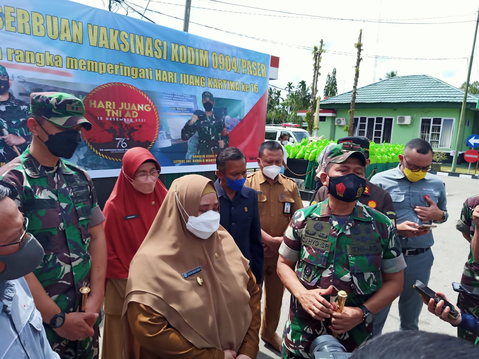 KaltimKita.com, TANA PASER - Orang nomor satu di Korem 091/Aji Surya Natakesuma (ASN) yaitu Brigjen TNI Cahyo Suryo Putro bertandang ke Kabupaten Paser. Danrem 091/ASN itu meninjau giat serbuan vaksin di Kodim 0904/Paser (Psr). Didampingi Dandim 0904/Psr Letkol Inf Ronald Wahyudi dan Wakil Bupati (Wabup) Paser Syarifah Masitah Assegaf beserta unsur Forkopimda, Brigjen Cahyo berharap capaian vaksin di Paser dalam waktu dekat sudah mencapai 70 persen sesuai target nasional.