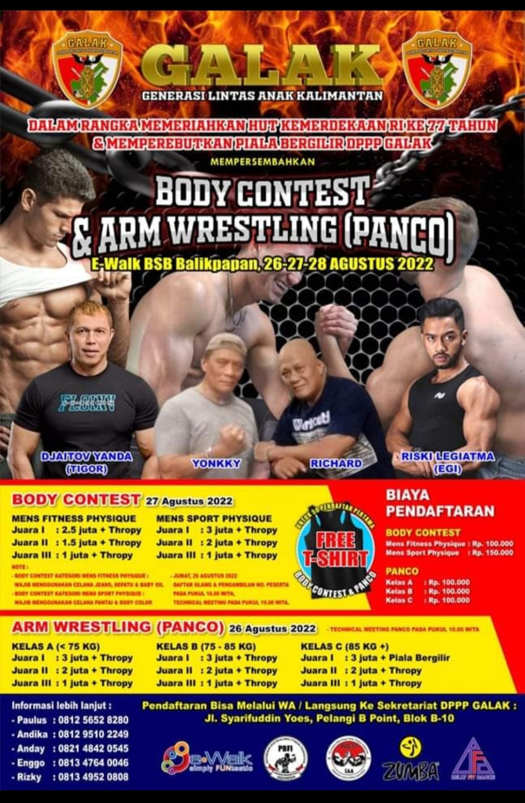 KaltimKita.com, BALIKPAPAN - Para pecinta panco di Kota Minyak kembali akan diberikan tontonan menarik. Kenapa tidak, Organisasi Masyarakat (Ormas) Generasi Lintas Anak Kalimantan (Galak) akan melaksanakan Kejuaraan Panco memperebutkan Piala DPPP Galak. Berlangsung di E-walk Balikpapan Super Blok (BSB), 26-28 Agustus 2022. Selain panco, Ormas Galak juga akan menggelar body contest dan zumba party.