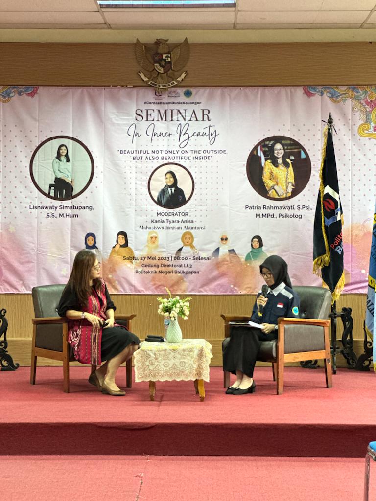 KaltimKita.com, BALIKPAPAN - Himpunan Mahasiswa Jurusan (HMJ) Akuntansi menggelar seminar In Inner Beauty, Jumat (26/5/2023) lalu. Mengundang dua narasumber internal yakni Patria Rahmawaty S.Psi., M.MPd dan Lisnawaty Simatupang, S.S.,M.Hum.