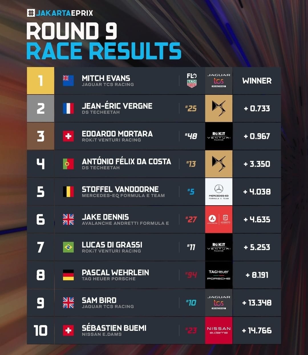 Di lap terakhir, momen penuh ketegangan pun melanda. Vergne, yang sebelumnya terus mengancam Evans, malah gantian diteror Mortara. Tapi posisi akhir tak berubah.