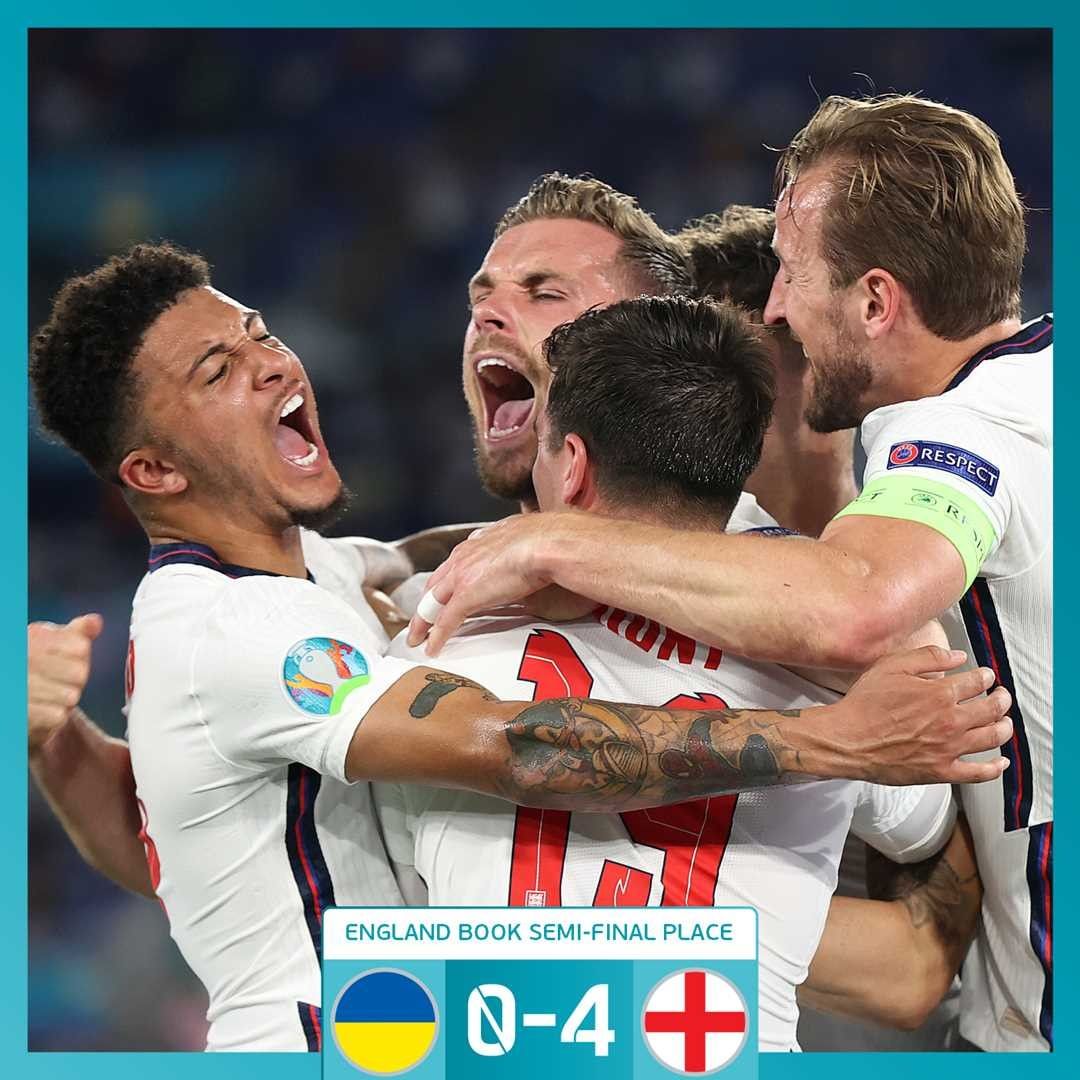The Three Lions menang telak dengan skor 4-0 Duel Ukraina vs Inggris di perempatfinal Piala Eropa 2020 digelar di Stadion Olimpico, Minggu (4/7/2021) dini hari WIB.