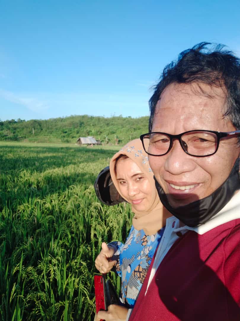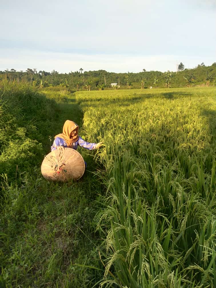 Istri kedua Kidang, Rusmini saat melihat hasil padi sawahnya yang sudah menguning.
