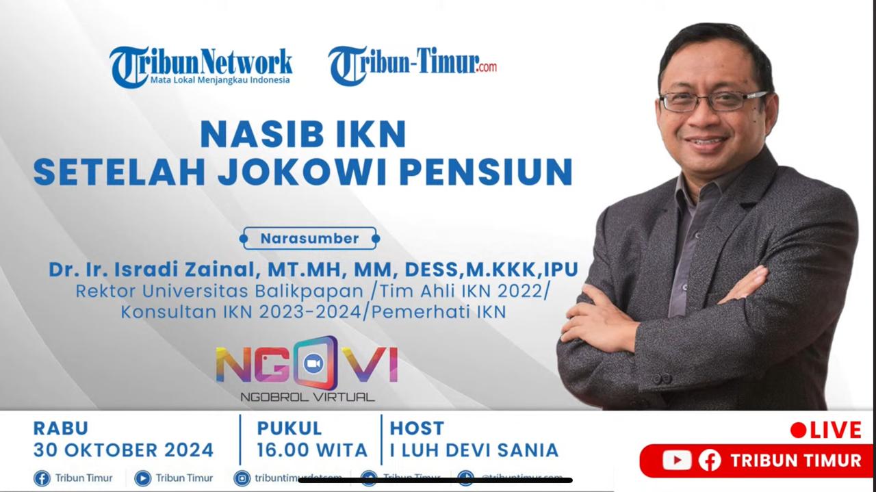KaltimKita.com, BALIKPAPAN - Rektor Universitas Balikpapan, Dr Isradi Zainal kembali menjadi pemateri dalam membahas pembangunan Ibu Kota Nusantara. Kali ini dalam ngobrol virtual garapan Tribun Timur, Rabu (30/10/2024) dengan tema Nasib IKN Setelah Jokowi Pensiun.