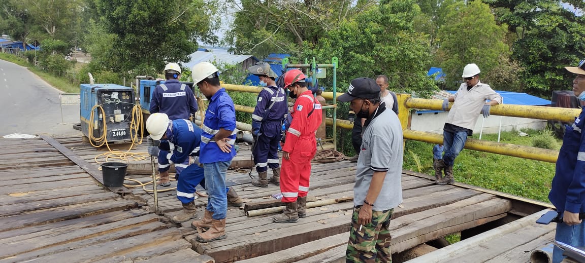 Kaltimkita.com, Kutai Kartanegara- beredar sosial media Jembatan Sambera di Kecamatan Muara Badak yang rusak berlubang kini mulai mendapatkan perbaikan semenstara oleh para perusahaan setempat sejak hari Sabtu (16/10/2021).