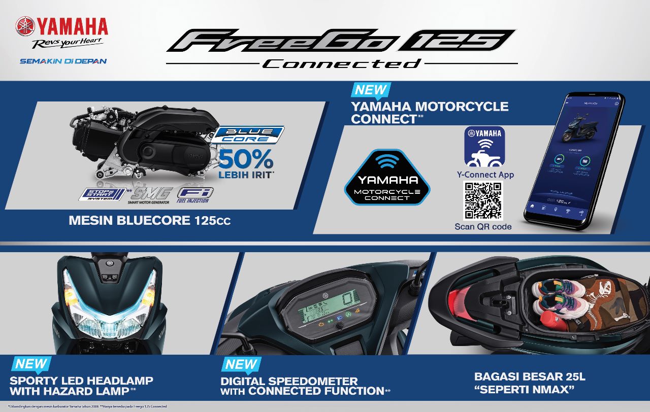 Yamaha FreeGo 125 Connected dengan tampilan Digital Speedometer lebih modern dan infomatif ini juga telah dilengkapi fitur canggih Yamaha Motorcycle Connect* yang sudah terkoneksi smartphone pengendara secara real time sehingga pengendara dapat mengetahui indikator notifikasi pesan dan telepon, baterai smartphone, serta jam digital. Selain itu pengendara dapat memonitor penggunaan berkendara sehari hari, seperti update konsumsi bahan bakar, rekomendasi perawatan (Engine Oil dan Battery /Accu), dan reminder waktu perawatan, lokasi dealer, rincian berkendara serta lokasi parkir. Keunggulan ini sesuai untuk keluarga muda aktif yang menginginkan kualitas dan gaya hidup semakin baik dan modern.