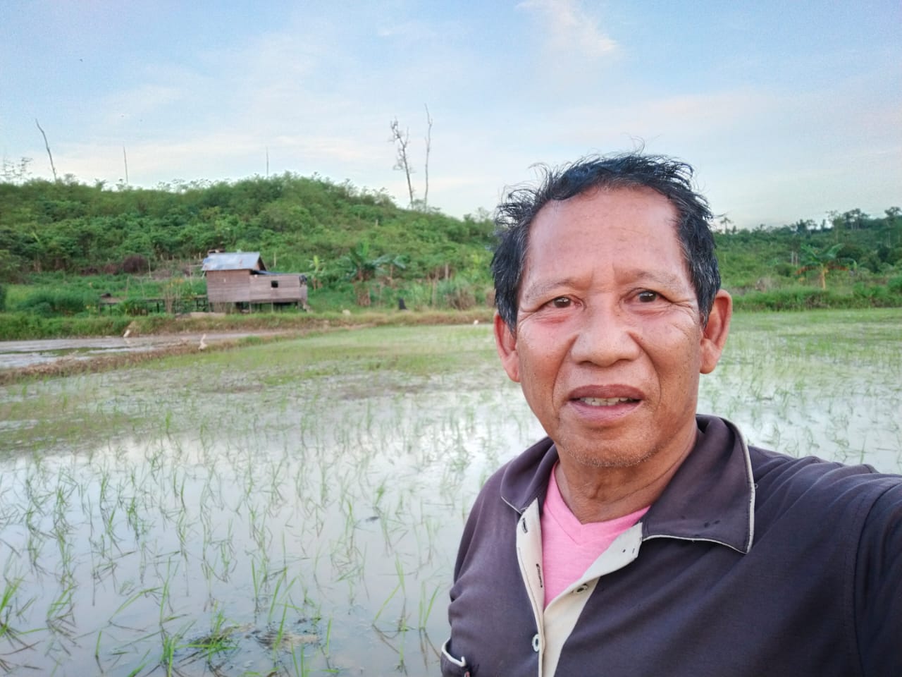 Tampak anggota DPRD Kutim Kidang berpose dengan latar belakang ladang padi sawahnya yang baru melalui proses penggarapan dengan menggunakan hand traktor