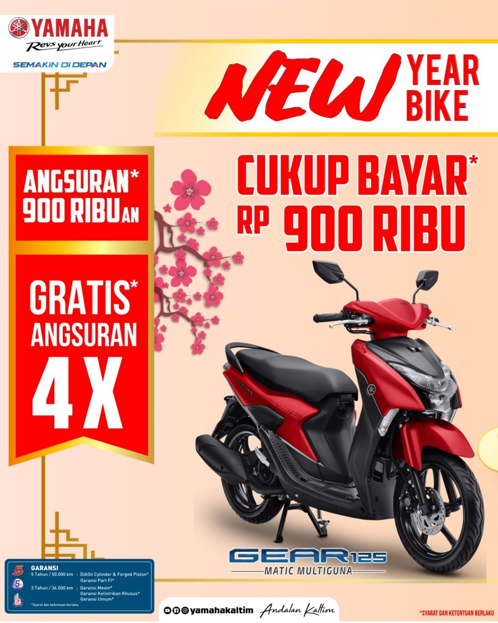 Ya, PT. Surya Timur Sakti Jatim (STSJ) selaku main dealer Yamaha di Kaltimtara di awal tahun 2023 ini menggeber promo bertajuk “New Year Bike 2023, Cukup Bayar* Rp 900 Ribu” kalian udah bisa membawa pulang sepeda motor impian, matik serbaguna Yamaha Gear 125.