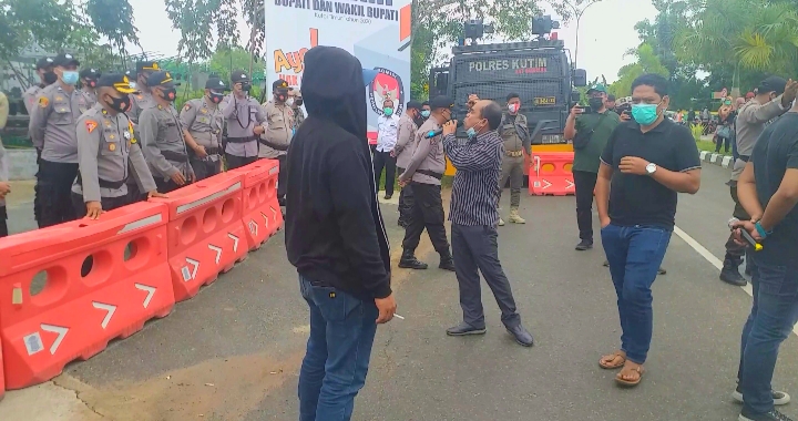 Tampak perwakilan advokasi jurkam paslon bupati/wabup Kutim Mahyunadi-Kinsu nomor urut 1 orasi suarakan usut tuntas pelanggaran kecurangan pada pilkada Kutim 2020