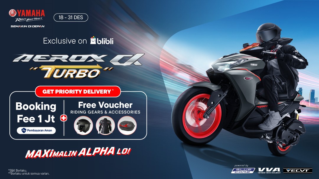 Program pemesanan online AEROX ALPHA dengan kuota terbatas ini tersedia di e-commerce Blibli dan dibuka mulai jam 19.00 WIB (18/12). Konsumen dapat melakukan order online dengan booking fee 1 juta rupiah, dan bisa mendapatkan beragam promo eksklusif* yaitu free voucher riding gear dan aksesoris motor serta potongan harga Rp 400 ribu untuk setiap transaksi pelunasan.