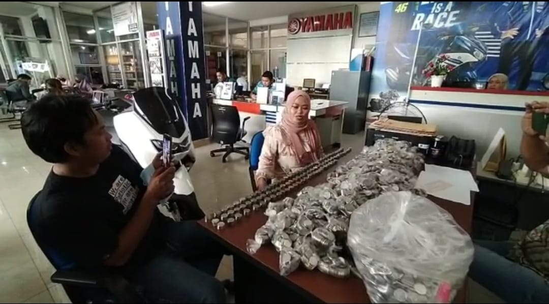Pasangan suami istri yang diketahui bernama Totok Tri Bartonnanto dan Hasnaini itu rupanya datang untuk membeli sebuah unit motor Yamaha di dealer tersebut. Tidak tanggung-tanggung, kantong tersebut berjumlah 31 ribu koin atau setara dengan nilai Rp 31.000.000,-. Bahkan saat akan menurunkan ribuan uang koin tersebut mereka turut dibantu pihak dealer Yamaha.
