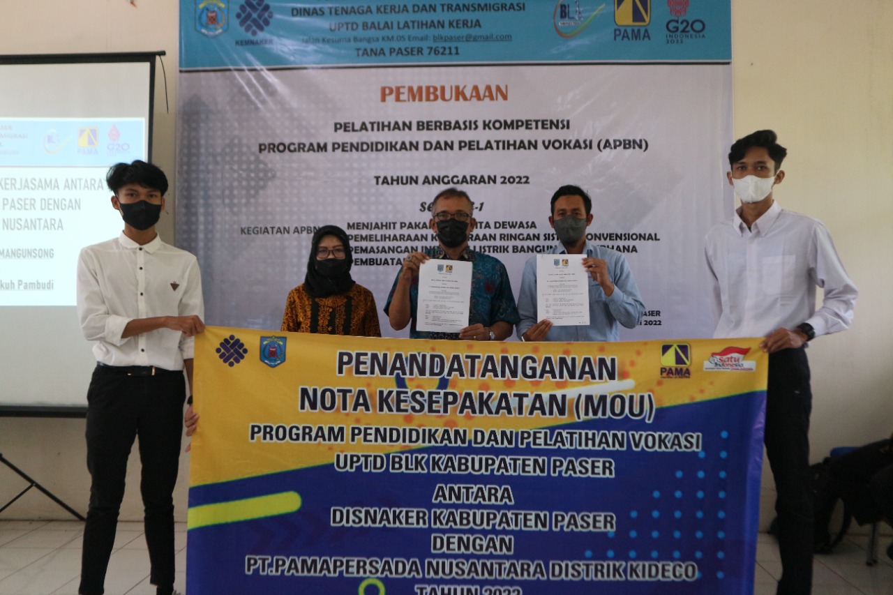 Dalam momen kegiatan pembukaan pelatihan BLK ini juga dilaksanakan simbolis penandatangan MoU antara Disnakertrans Kabupaten Paser dan PT. Pamapersada Nusantara terkait kesepakatan dalam kerjasama pengembangan kompetensi masyarakat melalui program-program pelatihan yang dilaksanakan UPTD BLK Disnakertrans Kabupaten Paser. (rul)