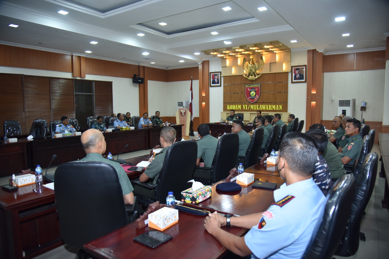 KaltimKita.com, BALIKPAPAN,- Panglima Kodam VI/Mulawarman Mayor Jenderal TNI Teguh Pudjo Rumekso didampingi Kasdam VI/Mlw Brigjen TNI Ibu Bintang Sertiawan dan Irdam VI/Mlw Brigjen TNI Bambang Idrayanto menghadiri Taklimat Akhir Audit kinerja Itjen TNI Periode II TA. 2022 yang dipimpin oleh Wairjen TNI, Mayjen TNI Farid Makruf, yang didampingi M.A. Irlat Itjen TNI, Brigjen TNI Ahmad Suprianto di ruang Yudha Makodam VI/Mlw Balikpapan Kamis (16/6/2022).
