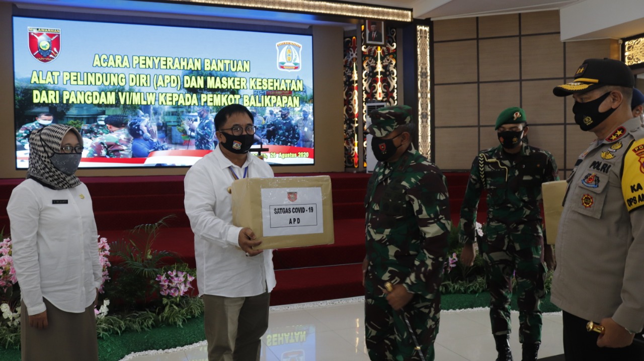 Kaltimkita.com,BALIKPAPAN - Pangdam VI/Mulawarman Mayjen TNI Heri Wiranto, S.E., M.M., M.Tr (Han) menyerahkan secara simbolis bantuan Alat Pelindung Diri (APD) dan Masker Satgas COVID-19 kepada Pemerintah Daerah Balikpapan yang bertempat di Aula Makodam VI/Mulawarman, Rabu (26/08/2020).