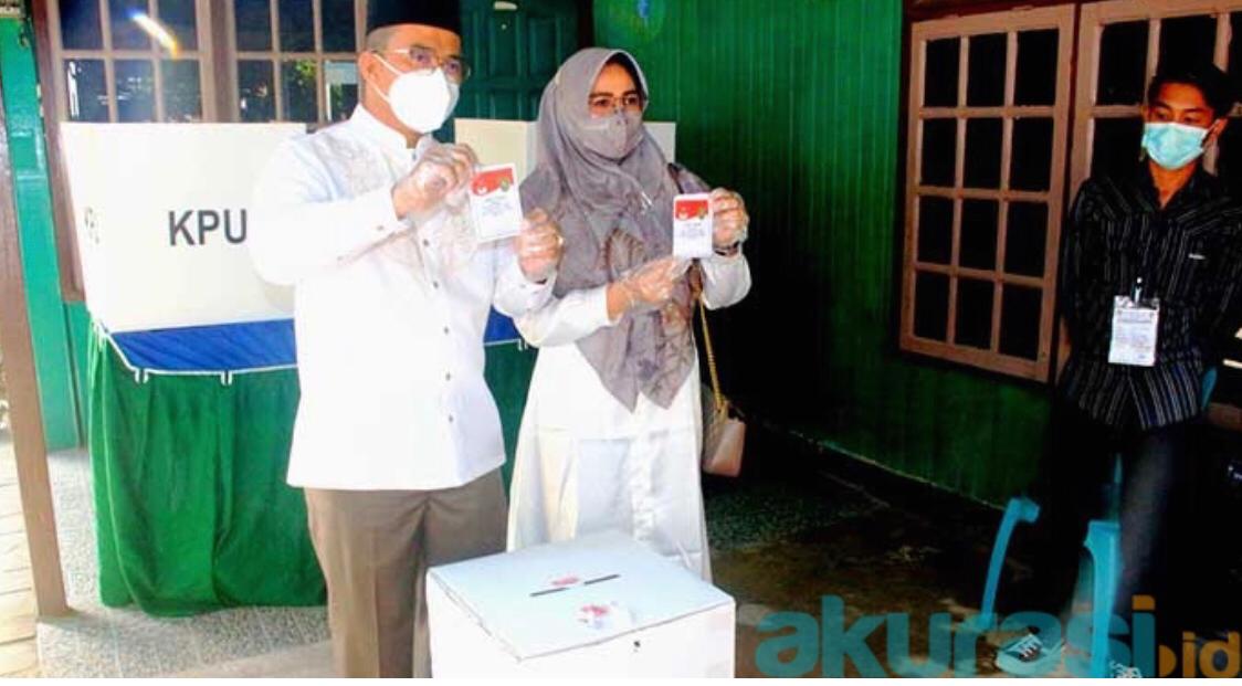 Tak lupa mengucapkan "Bismillahirrahmanirrahim" paslon bupati nomor satu Mahyunadi dan istri bunda Masriati memasukkan kertas surat suaranya ke kotak suara