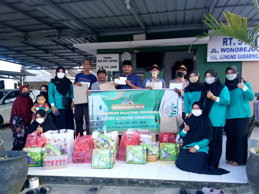 Pemberian Gaji, THR, serta Bingkisan yang dilaksanakan tiap tahun ini, diberikan kepada lima orang penjaga keamanan dan satu petugas kebersihan di Pos Kampling RT 51, Jalan Wonorejo 3, Kelurahan Gunung Samarinda, pada Selasa (26/4/2022) sore.