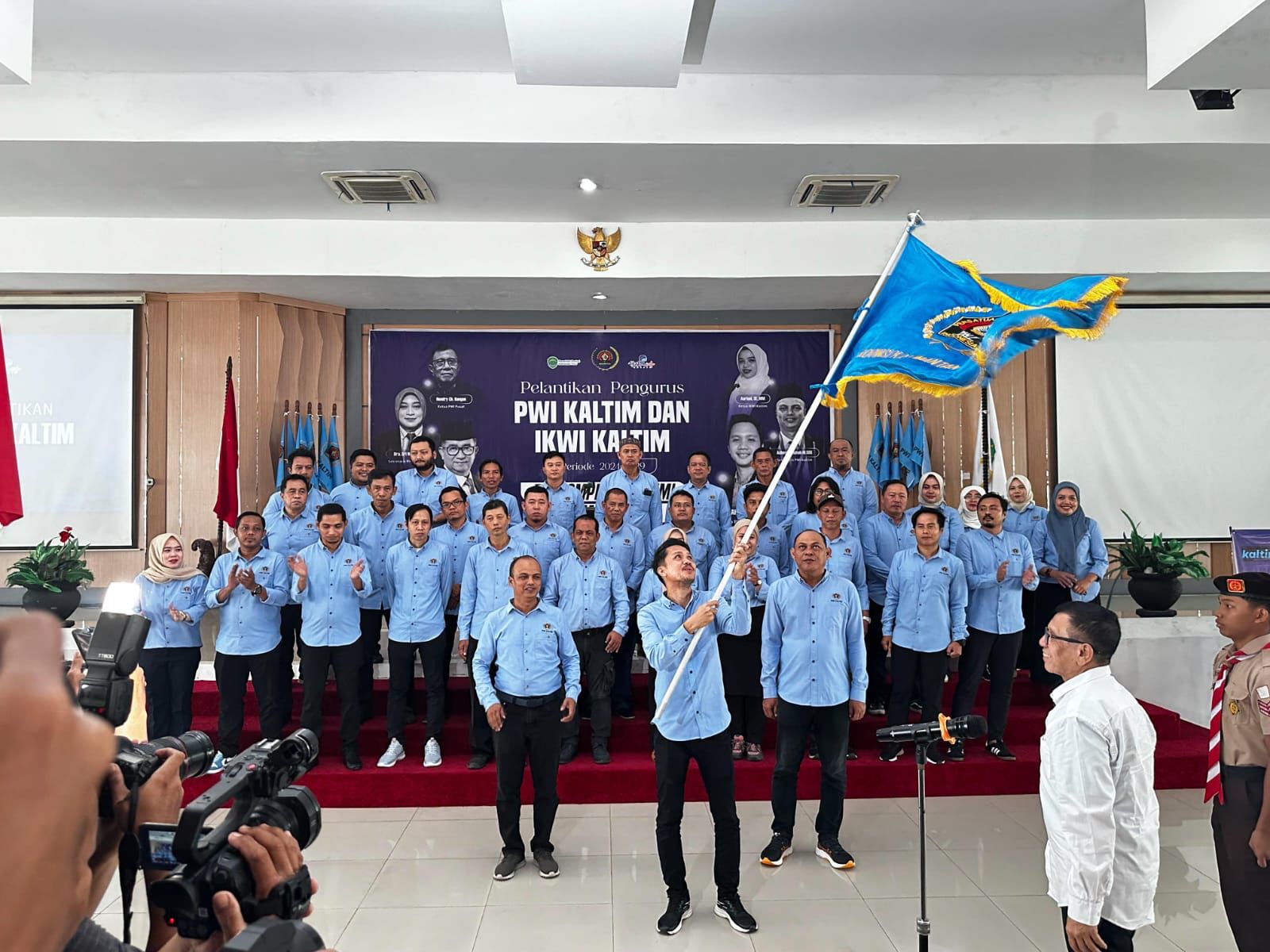 Kaltimkita.com, SAMARINDA- Abdurrahman Amin resmi dilantik sebagai Ketua Persatuan Wartawan Indonesia (PWI) Kalimantan Timur (Kaltim) oleh Ketua PWI Pusat, Hendry Ch Bangun, di Gedung Olah Bebaya Lamin Etam, Jumat (26/7/2024). Usai dikukuhkan, Abdurrahman sempat mengibarkan pataka PWI disambut tepuk tangan undangan yang hadir.