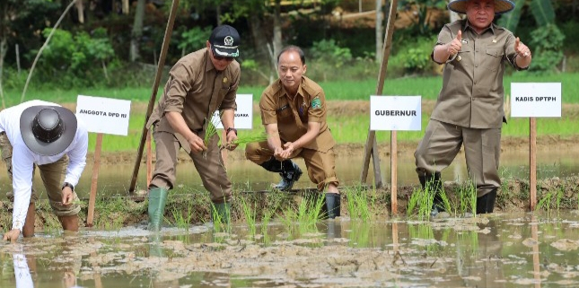 Kaltimkita.com, KUTAI KARTANEGARA – Asisten II Setkab Kutai Kartanegara (Kukar) Wiyono mendampingi kunjungan kerja Gubernur Kaltim Isran Noor pada kegiatan Gerakan Tanam Padi 1.000 hektar yang digelar Dinas Pangan, Tanaman Pangan Dan Holtikultura (DPTPH) Provinsi Kaltim di areal persawahan Kelompok Tani Citarum Kelurahan Bukit Biru Kecamatan Tenggarong, Senin (3/7/2023).