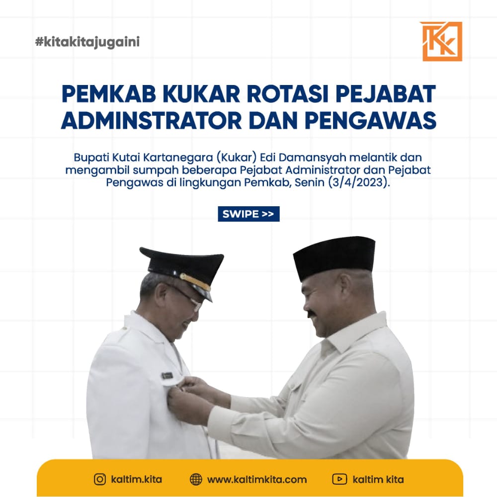 Kaltimkita.com, KUTAI KARTANEGARA – Bupati Kutai Kartanegara (Kukar) Edi Damansyah melantik dan mengambil sumpah Pejabat Administrator dan Pejabat Pengawas di lingkungan Pemkab Kukar, di ruang serba guna Kantor Bupati Kukar, Senin (3/4/2023).