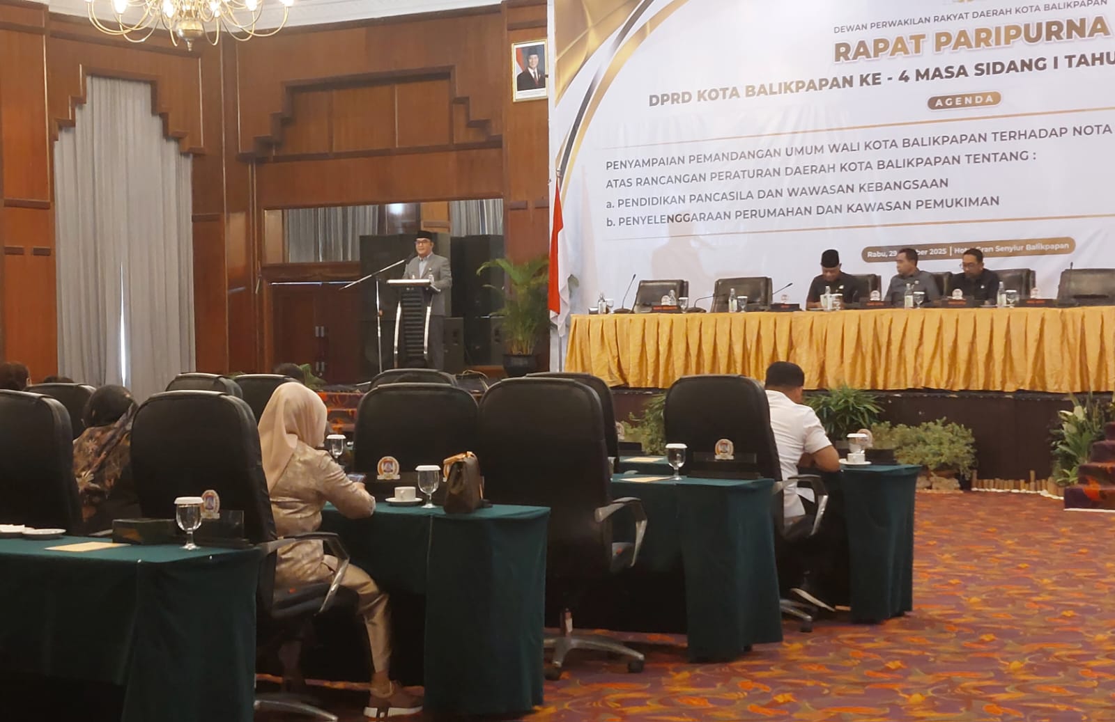 Kaltimkita.com, BALIKPAPAN - Pemerintah Kota Balikpapan melalui Wakil Wali (Wawali) Kota, Bagus Susetyo memberikan pandangan umum terhadap dua Rancangan Peraturan Daerah (Raperda) yang diinisiasi oleh DPRD Kota Balikpapan, Rabu (29/10/2025), di Ballroom Hotel Grand Senyiur. Kedua Raperda tersebut adalah Raperda tentang Pendidikan Pancasila dan Wawasan Kebangsaan, serta Raperda tentang Penyelenggaraan Perumahan dan Kawasan Permukiman.