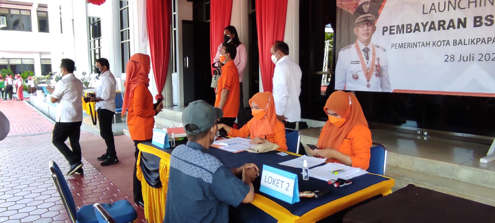 Kaltimkita.com, BALIKPAPAN - Pemerintah kota Balikpapan memberikan Bantuan Sosial Tunai (BST) bagi warga yang terdampak Pemberlakuan Pembatasan Kegiatan Masyarakat (PPKM) sejumlah Rp 300 ribu, di halaman Kantor Pemkot Balikpapan, pada Rabu (28/7/21).