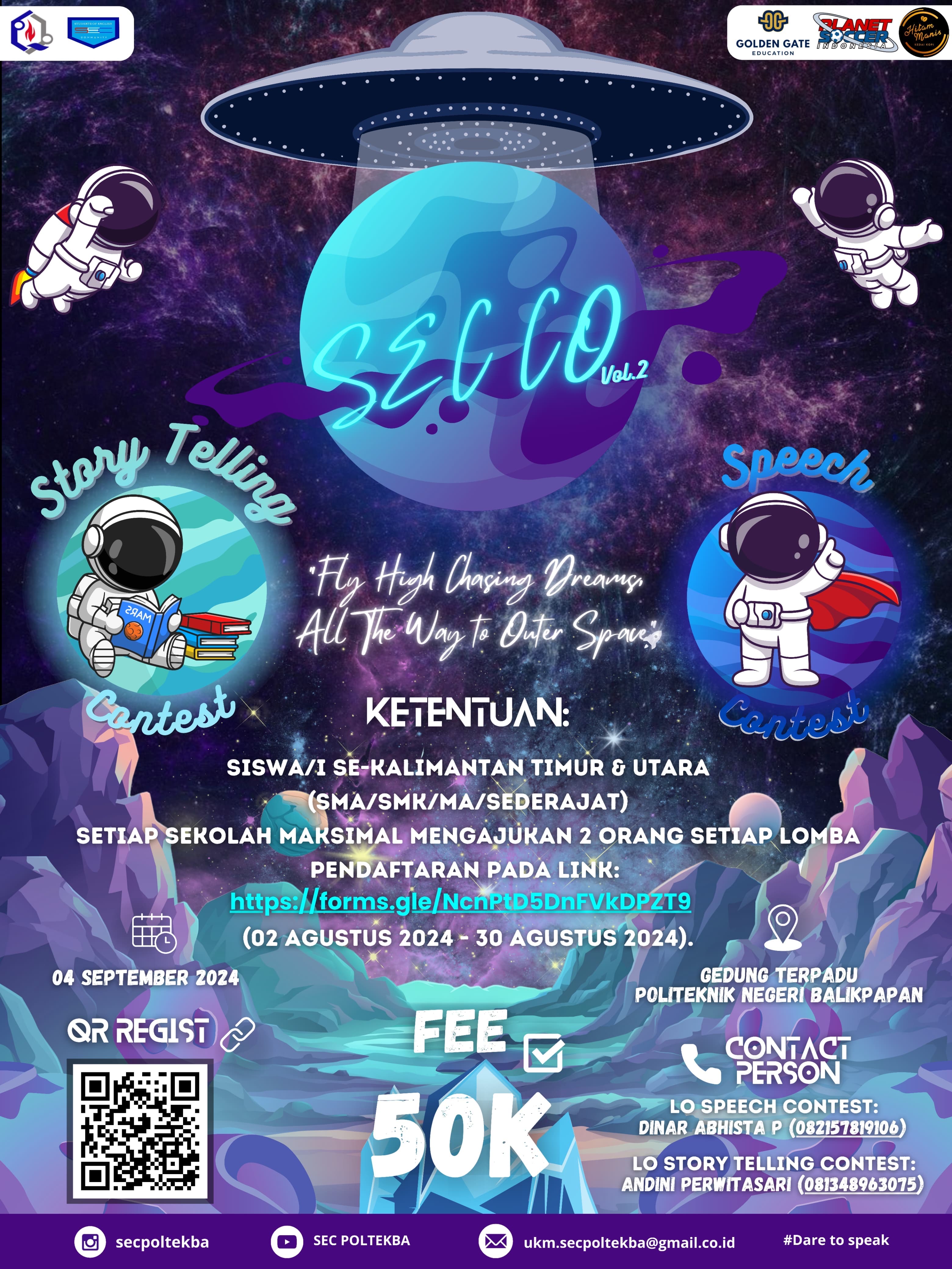 KaltimKita.com, BALIKPAPAN - UKM Students of English Community (SEC) Poltekba kembali akan melaksanakan kompetisi antar pelajar tingkat SMA se-Kaltim dan Kaltara volume kedua. Memeriahkan Dies Natalis ke-22, kategori Speech dan Story Telling, berencana akan dipertandingkan yang berlangsung pada 4 September 2024 di Gedung Terpadu.