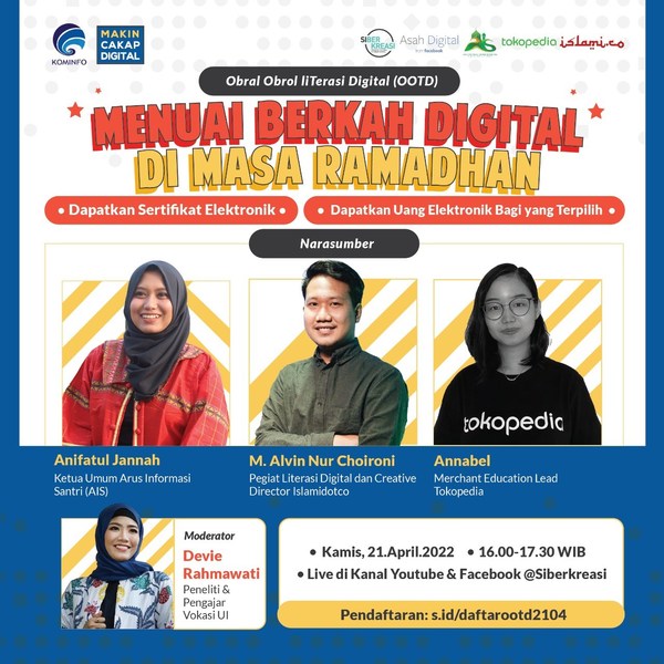 Momen ini membuka kesempatan emas bagi individu yang ingin berkreasi dan membuat peruntungan di ranah digital. Untuk memanfaatkan peluang ini, individu perlu dibekali kemampuan literasi digital seperti keterampilan, etiket, keamanan, dan budaya digital. Peningkatan keterampilan digital inilah yang menjadi fokus webinar "OOTD" bertema "Menuai Berkah Digital di Masa Ramadan" yang diadakan Kemenkominfo bersama Siberkreasi sebagai bagian dari kampanye #MakinCakapDigital. Bincang santai bersama para pakar digital literasi ini akan membahas tren-tren digital yang muncul selama bulan suci Ramadan.