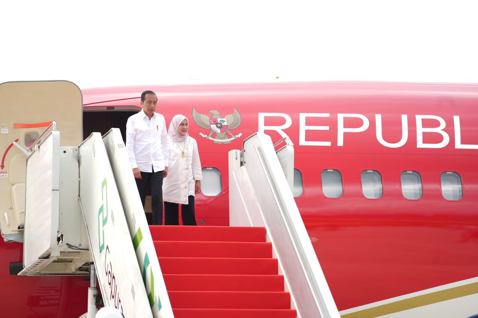 Kaltimkita.com, PENAJAM– Presiden Jokowi dan Ibu Negara Iriana Jokowi untuk pertama kalinya mendarat di Bandara Nusantara, Penajam Paser Utara, Kalimantan Timur, Jumat (11/10), menggunakan Pesawat Kepresidenan seri Boeing 737-800.
