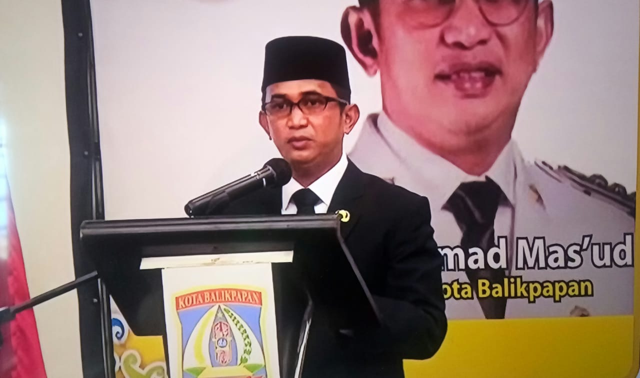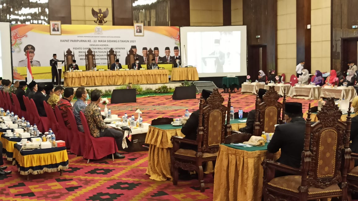 Kaltimkita.com, BALIKPAPAN - Wali Kota Rahmad Mas'ud menyampaikan pidato pertamanya sebagai walikota periode 2021-2024 di Rapat Paripurna DPRD ke 22 masa sidang II tahun 2021 di ruang Ballroom Hotel Novotel Balikpapan, Rabu (2/6/21).