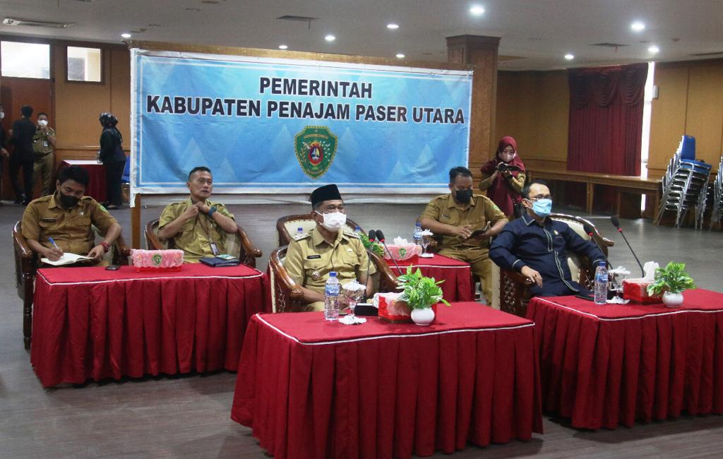 Kaltimkita.com, PENAJAM - Pelaksana tugas (Plt) Bupati Penajam Paser Utara (PPU) Hamdam ikuti rapat kerja (Raker) bersama Menteri Dalam Negeri (Mendagri), Ketua Komisi Pemberantasan Korupsi (KPK) dan Lembaga Kebijakan Pengadaan Barang/Jasa Pemerintah (LKPP) yang digelar melalui video conference di Aula Lantai I Kantor bupati PPU, Senin 24/1).
