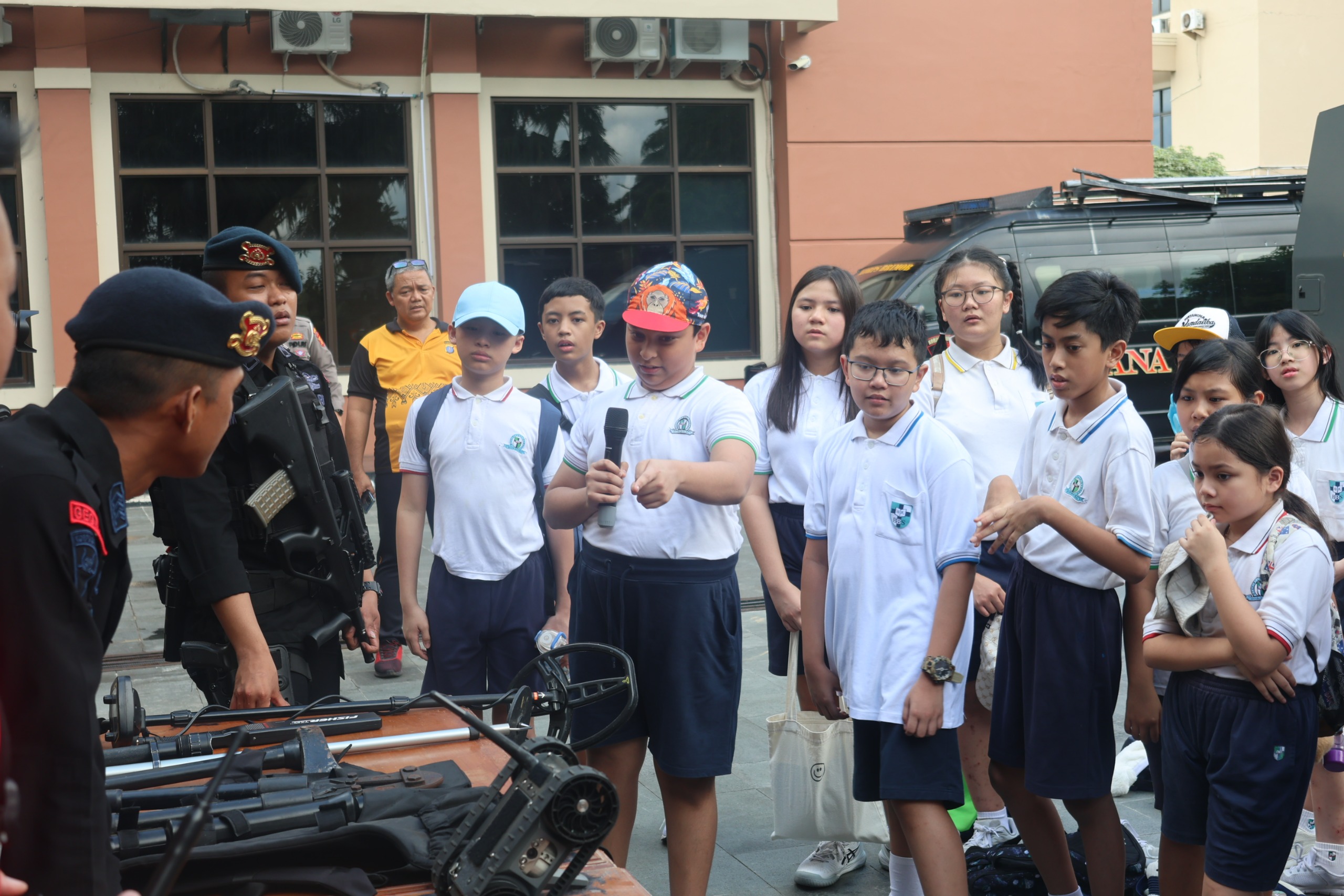 Dalam kunjungan tersebut, para murid dikenalkan alusista seperti mobil Ditlantas, armada barracuda Brimob dan senjata milik Brimob Polda Kaltim.