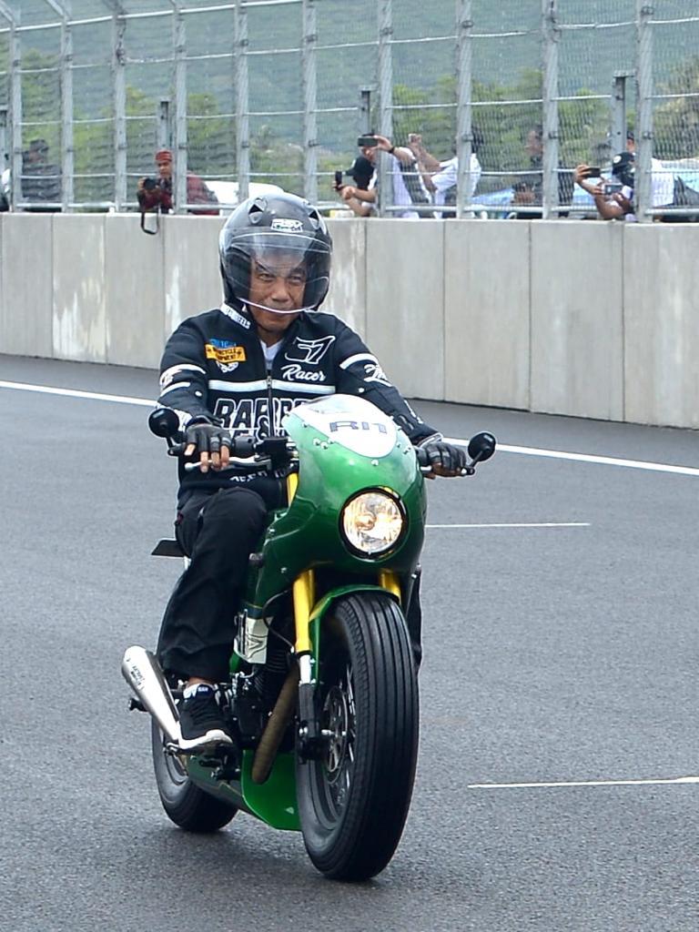 Dalam kesempatan itu, Presiden menaiki motor custom berwarna dominan hijau miliknya. Berjaket hitam lengkap dengan helm warna senada, Presiden Jokowi mulai menjajal aspal mulus Sirkuit Mandalika yang memiliki panjang 4,3 kilometer itu.